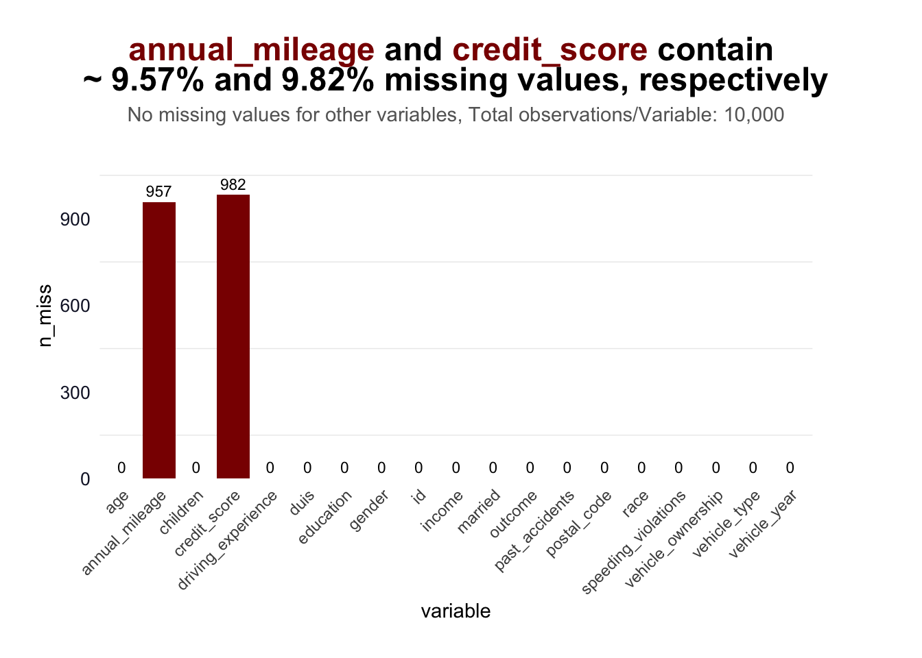 library(naniar)# For missing data visualizationlibrary(ggtext)# For enhanced text formatting in ggplot2 titlesmissing_counts<-miss_var_summary(Cars)text_color<-"#151931"subtitle_color<-"gray40"caption_color<-"#666666"plot<-ggplot(missing_counts, aes(x =variable, y =n_miss))+geom_col(fill ="darkred")+# Bar plotgeom_text(aes(label =n_miss), vjust =-0.5, size =3)+# Add countslabs( title ="<span style='font-size:18pt'><span style='color: darkred'>annual_mileage</span> and <span style='color: darkred'>credit_score</span> contain <br> ~ 9.57% and 9.82% missing values, respectively</span>", subtitle ="No missing values for other variables, Total observations/Variable: 10,000")+theme_minimal()+theme( plot.title =element_markdown(hjust =0.5, face ="bold", margin =margin(b =5)), plot.subtitle =element_text(hjust =0.5, color =subtitle_color, margin =margin(b =15)), plot.caption =element_text(hjust =0, color =caption_color, margin =margin(t =10)), axis.text.y =element_text(color =text_color, size =10), axis.text.x =element_text(angle =45, hjust =1), panel.grid.major =element_blank(), # Remove major grid lines#panel.grid.minor = element_blank(), # Remove minor grid lines legend.position ="none", # Hide legend as colors are explained in title/subtitle plot.margin =margin(20, 60, 20, 20)# Adjust plot margins for better layout)+scale_y_continuous(expand =expansion(mult =c(0, 0.15)))plot