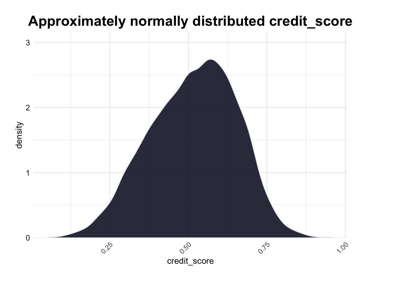 Cars%>%ggplot(aes(x=credit_score))+geom_density(fill="#151931", color="#e9ecef", alpha=0.9)+labs( title ="<span style='font-size:18pt'>Approximately normally distributed credit_score</span>")+theme_minimal()+theme( plot.title =element_markdown(hjust =0.5, face ="bold", margin =margin(b =5)), plot.subtitle =element_text(hjust =0.5, color =subtitle_color, margin =margin(b =15)), plot.caption =element_text(hjust =0, color =caption_color, margin =margin(t =10)), axis.text.y =element_text(color =text_color, size =10), axis.text.x =element_text(angle =45, hjust =1), #panel.grid.major = element_blank(), # Remove major grid lines#panel.grid.minor = element_blank(), # Remove minor grid lines legend.position ="none", # Hide legend as colors are explained in title/subtitle plot.margin =margin(20, 60, 20, 20)# Adjust plot margins for better layout)+scale_y_continuous(expand =expansion(mult =c(0, 0.15)))